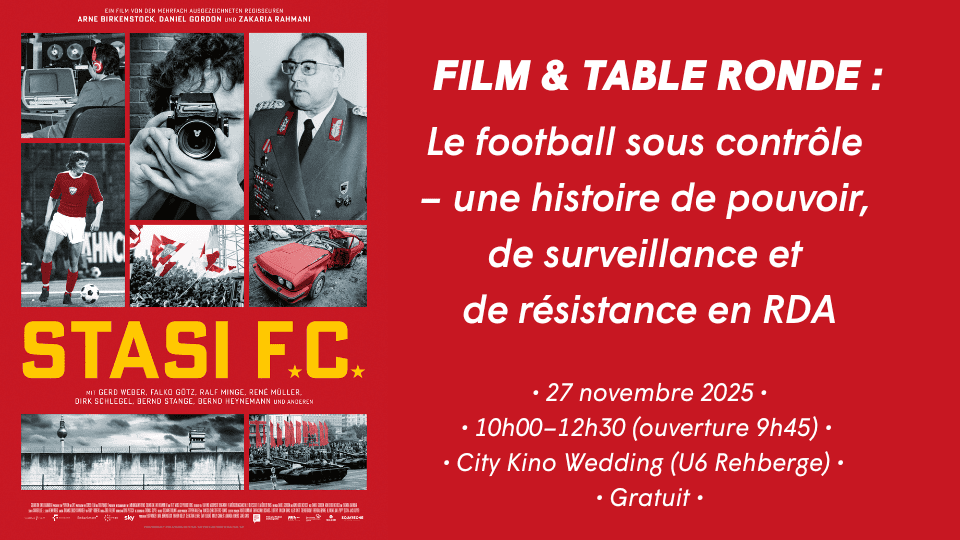Le film Stasi F.C. porte un regard sur le rôle du football en RDA sous le régime socialiste et ses liens entre la surveillance et la propagande pendant la guerre froide. À l’issue de la projection, une table ronde destinée aux jeunes, avec des témoins et des participant·es, abordera la question de savoir dans quelle mesure le football a été utilisé comme instrument de propagande et de dictature, et quelle importance du devoir de mémoire de ces injustices historiques a encore aujourd’hui pour la cohésion sociale en Allemagne et en Europe.